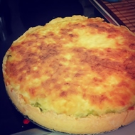 Now grease the baking dish with butter and dust it lightly with flour so that the buttered part of the dish is just slightly coated with flour. Then place the dough in the dish, carefully stretching and spreading it into a thin layer, creating low edges. After that, add the leek and pour the egg, cream, and cheese mixture evenly over it.