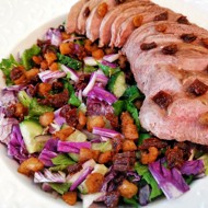 Slice the fillet thinly, add it to the salad, and serve topped with cracklings and sun-dried tomatoes.