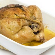 Place the bouquet garni inside the chicken. Spread butter over the skin and season to taste. Place the chicken in a baking dish along with unpeeled garlic cloves and a second bouquet garni. Roast for one and a half hours in an oven preheated to 356°F, basting frequently with the juices that accumulate.