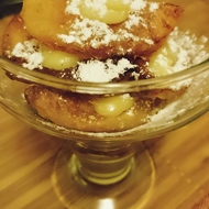 Peel the apples, remove the seeds, cut each into 4 pieces, coat in flour, and fry in oil.