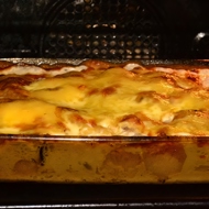 Peel the potatoes and slice them into rounds. Cut the meat (lamb can be used) into pieces and tenderize it. Slice the onion into rings, finely chop the mushrooms, and grate the cheese.