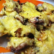 Place the meat on a greased baking sheet. Top it with a thin layer of onions. Drizzle mayonnaise over the meat. Sprinkle with grated cheese.
