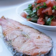 Pat the cooked fish dry with a paper towel to remove excess fat and serve with the tomato salad.
