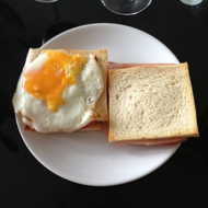 Fry an egg in butter. Be careful not to break the yolk! Remove the toasts from the oven, and place the fried egg on one of them — this is the Croque Madame with a hat.