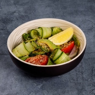 Arrange the salad mix, onion, avocado, and tomatoes on a plate, and garnish with cucumber slices.