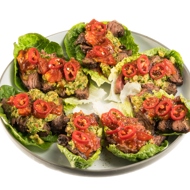 Slice the remaining half of the chili pepper into thin rings. Cut the steak into large pieces. Arrange mini romaine leaves on a plate, place the meat on top, followed by chimichurri and roasted tomatoes. Garnish with chili rings and sprinkle with black pepper.