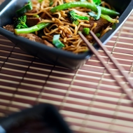 Add the chopped asparagus and broccoli, thinly sliced garlic, and chopped green onion. Stir-fry for 1 minute, then add the noodles and a spoonful of water. Cover and cook for 4 minutes until the broccoli is tender.