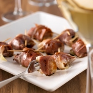 Cut the cheese into strips about 1 cm thick and slightly longer than the width of the bacon slices. Cut the bacon in half. Wrap a piece of cheese in each half and secure it with a wooden skewer.
