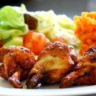 Remove the chicken, which has been browned on both sides until a pink crust forms, and cut it into portions. Serve with a complex garnish and salad depending on the season.