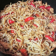 Heat a wok over medium heat for 1-2 minutes until it starts to smoke, then add vegetable oil. Add chicken cut into strips and diced bell peppers, and stir-fry for 2 minutes. Next, add the noodles and vegetables and cook for another 3 minutes. Pour in lightly beaten eggs and stir-fry until the eggs are fully cooked.