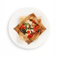 On two squares, place a couple of kaffir lime leaves, a few strips of green onion, then the chicken, followed by more onion, and finish with the tomatoes and mushrooms (wild mushrooms, champignons, fresh or frozen will work). Close with the second squares, fold the edges, and secure with a stapler.
