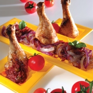 Arrange the chicken on 4 plates and drizzle with tomato sauce. Surround the chicken with the caramelized onions. Drizzle with a little olive oil.