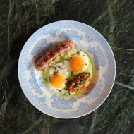 Grill or pan-fry the chorizo. Place the chorizo, eggs, and ajvar on a plate.
