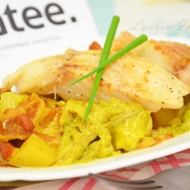 Fry the fish in the remaining olive oil (about 3 minutes on each side). Season the vegetables in the creamy sauce to taste and serve on plates alongside the pieces of fish.