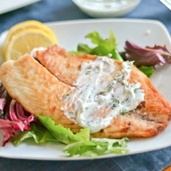 Season 4 fish fillets (115 g each, originally tilapia) with salt and pepper on both sides. Dredge in flour.