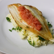 Fried Flounder with Mashed Potatoes and Tomato-Pear Sauce