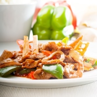 In the wok, heat the sunflower oil and add the mixture with lemongrass, sauté until fragrant, but do not let the garlic burn. First, add the zucchini and sauté for a minute, then add the green bell pepper and sauté as well. Next, add the mushrooms, sauté for another minute, and finally add the snap peas. Sauté lightly and pour in the soy sauce mixture.