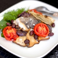 Serving: on a warm plate, arrange the beet leaves and fried slices of porcini mushrooms, then the hake fillet, surrounding it with roasted pieces of fennel, sweet onion, and tomatoes, add dried Aragon olives, drizzle with the remaining hot aromatic olive oil, season with coarse sea salt, and sprinkle with black ground pepper.