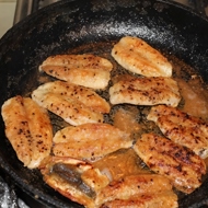 Pour oil into a hot skillet, place the fillet skin side down, and gently press it down with a spatula to prevent it from curling. It's best not to touch or flip the fish until it's almost done, which takes about 3-4 minutes. Reduce the heat to medium, flip the fillet, and turn off the heat.