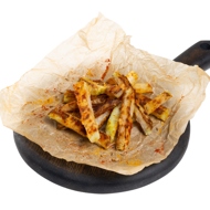 Peel the kohlrabi and cut it into large sticks, measuring approximately 1 by 5 centimeters.