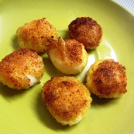 Meanwhile, in one bowl, crack the eggs and lightly beat them. In another bowl, place the breadcrumbs. Roll the cheese balls first in the egg, then in the breadcrumbs, again in the egg and breadcrumbs, ensuring the cheese is well coated. Transfer to a parchment-lined sheet.