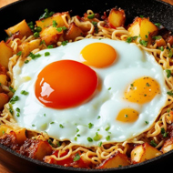 Add the eggs in the center of the pan and fry them to your desired doneness. Add spices to taste. Serve with ketchup and mayonnaise.