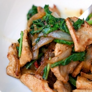 In hot oil, fry the pork until golden brown, then add the sliced sweet onion, chili, fish sauce, pepper, and salt.
