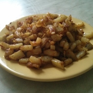 Add the potatoes, butter, curry powder, and salt. Fry until cooked through.