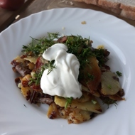 The creamy flavor complements the potatoes and mushrooms. Instead of adding sour cream at the end, you can fry the potatoes in butter or use sunflower oil and add butter halfway through cooking. Fresh honey mushrooms or other wild mushrooms can be used instead of frozen ones.