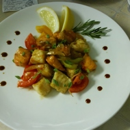 Meanwhile, prepare the vegetables and sauté them in a pan. Add the fried fillets to the pan and sauté for about 2 minutes. Add the sweet and sour sauce and soy sauce. Voila! The dish is ready. Garnish with 2 lemon wedges and a sprig of fresh rosemary.