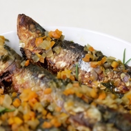 Remove the insides from the sardines. Rinse the fish under running water, dry with paper towels, season with salt, coat in flour, and fry in olive oil.