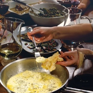 Melt the butter in a skillet, then add the olive oil and heat the mixture well. Butter has the unfortunate tendency to burn over high heat, so adding olive oil is not only a matter of flavor but also of preservation: the butter won't burn as quickly when combined with vegetable oil. However, it's important to use refined vegetable oil rather than fresh-pressed oil. To be completely safe, consider using clarified butter instead of regular butter. This way, you'll be able to fry a lot of cheese in a small amount of hot fat.