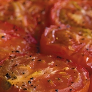 Select ripe whole tomatoes, rinse them in cold water, cut them in half crosswise, and sprinkle with salt and pepper.