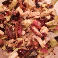 Tear the frisée lettuce by hand, mix it with bacon, dates, and onion, divide it onto plates, sprinkle with goat cheese and nuts, and drizzle with the remaining honey.