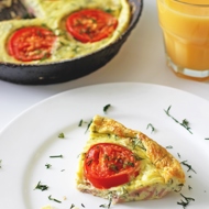Grease a baking dish with oil and pour in the egg mixture, then top with sliced tomato. Place in a preheated oven at 374°F for about 20 minutes until golden brown.