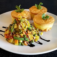 While the frittatas are baking, sauté the vegetable mix in a hot skillet until cooked through. Transfer to a plate. In the same skillet, sauté the diced pre-cooked potatoes (you can also use raw, as small cubes cook quickly) with rosemary leaves until crispy. Mix the potatoes with the sautéed vegetables, season with salt and pepper — the side dish is ready.