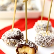 Melt the chocolate in a double boiler. Coat the bananas with chocolate and sprinkle with coconut flakes.