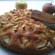 Pour the batter into a baking dish, spreading it evenly. Top with sliced apples, distributing them evenly and pressing them into the batter.