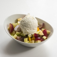 Four types of fruit, soaked in orange juice, and vanilla ice cream. Even a child can make this salad; it's no wonder the recipe was featured in a popular cookbook. Inspired by a fruit salad recipe from a well-known children's book.