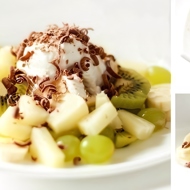 Arrange all the fruits on a plate, top with a scoop of ice cream, and sprinkle with chocolate chips.
