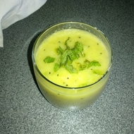 Blend the kiwi, banana, green apples, and mint in a blender.