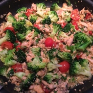 Add the broccoli, hot smoked fish, and finely chopped basil and parsley, mix, turn off the heat, and keep warm.