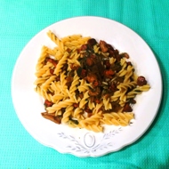 Drain the water and mix the fusilli with the chanterelles, gradually adding some of the reserved cooking water to prevent the dish from being too dry, and drizzle with truffle oil.