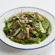 In a salad bowl, combine the cucumbers, radishes, onions, apples, and microgreens.