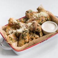 This is our favorite, which is no surprise. The combination of butter and Parmesan creates a perfect sauce that everyone will love. The wings turn out to be versatile, with a mild flavor that has no overpowering accents — they pair wonderfully with wine, beer, or a serious long drink. When preparing, pay attention to the consistency of the butter — it should be fully melted, not just softened, meaning it should be liquid — a stove or microwave will help with this. Only then will it form a harmonious blend with the cheese, allowing the wings to soak up the sauce properly. These wings are great served with Caesar dressing — you can make it yourself or go with a trusted store-bought option.