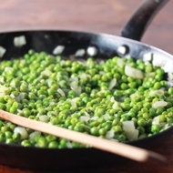 Add the frozen green peas and a tablespoon of water. Season with salt and pepper. Cover and simmer for about 10 minutes, until the peas are tender.