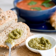 In a blender, combine chopped garlic scapes, pine nuts, Parmesan, olive oil, a little lemon juice, salt, and pepper. Blend until smooth.