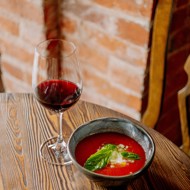 Add sherry vinegar, olive oil (40 ml), and Tabasco. When serving, add stracciatella and diced cucumber (100 g).