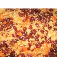 Layer in a pot: lavash, rice with noodles, onion.