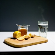 Slice 10 thin pieces from fresh ginger root. Place them in a large glass, and add 1 slice of fresh lemon. You can also add star anise or cinnamon to taste. Pour boiling water over the mixture and cover it, allowing it to steep for about 10–15 minutes.